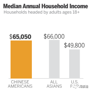 整个美国家庭收入中位数比较,亚裔家庭为6,6000美元,华人家庭为6,5050美元,高出美国居民平均水平。
