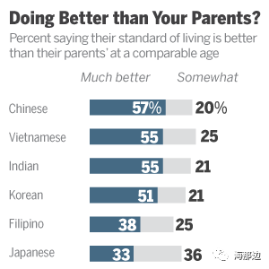 有57%的华人认为,自己现在的生活比父辈要好。这也是除日裔外,大部分亚裔的共识。