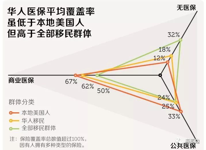 在拥有医保上,华人也高出全部移民群体,只略低于本地美国人。