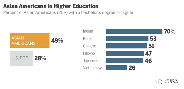 在25岁以上受教育程度来看,美国人获得本科学历的平均水平为28%,华人为51%,这与华人家庭特别重视教育有关。