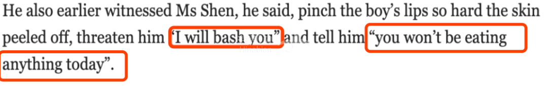 根据在场的保洁人员Voon Kok Chu 表示,自己看到了全过程,当时这对年轻留学生把孩子赶到了卧室,沈星彤就就一直在撕扯孩子的嘴唇,十分暴力。