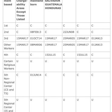 名词解释:1.优先日期(Priority Date):代表移民局收到移民申请的日期。2.截止日期(Cut-off Date):由于受到签证名额和某些类别名额已满的限制,美国国务院签证办公室(DOS)每个月会发布一个基于优先日期(Priority Date)的签证排期表(Visa Bulletin),以决定【1】在美国境内的申请人何时可以提交“身份调整申请”(I-485表格),或【2】在美国境外的申请人何时可以进行领事馆程序(Consular Processing)。***** 以申请人“出生地”为原则决定应使用哪个截止日期,假如申请人为中国出生但从小在加拿大生活,仍然适用中国的截止日期。(一)工作类签证:1.表A排期:申请人递交申请后,移民局会寄发I-797通知,上面会有您的优先日期。当【优先日期时间早于截止日期】,(申请EB5的人I-526已批准),代表在美国的申请人可以递交I-485身份调整,在中国境内的可以进行NVC领事馆程序。以下为2017年4月份工作类的排期
